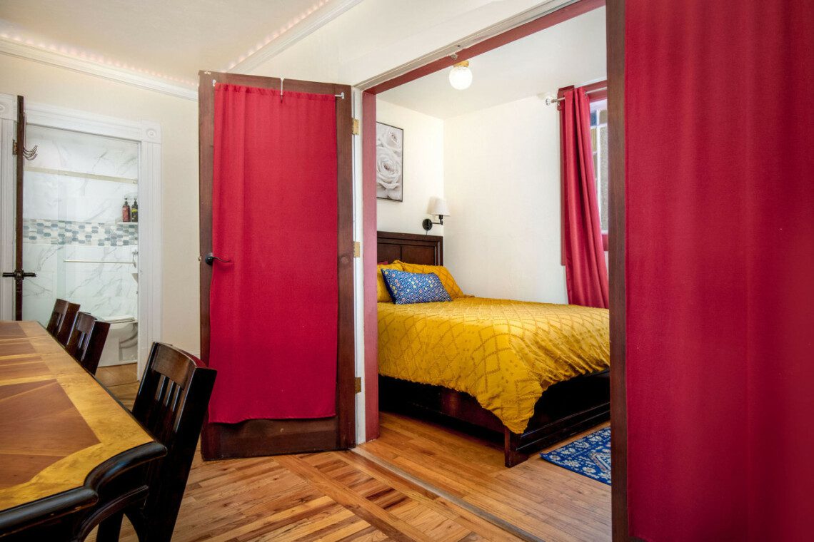 The cozy second bedroom offers a Queen bed, dresser, mirror, and space to hang your garments. There are french doors and a colorful stained glass window, all with blackout curtains.